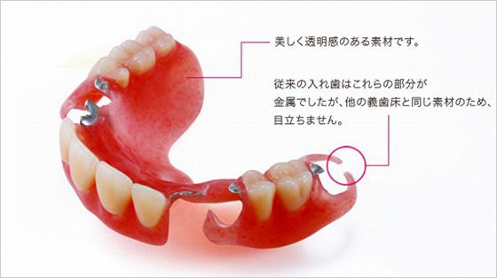 透明度の高い素材で、金属バネを使用せず、ひと目で入れ歯とはわからないほど自然で目立ちにくく、審美性に優れています。新開発された樹脂から製作している為、従来の入れ歯と比べて大変軽くしなやかで、入れ歯を付けているのを忘れてしまうほど、ジャストフィットします。